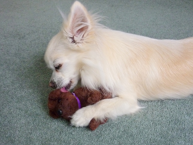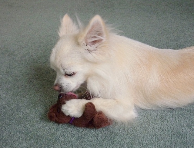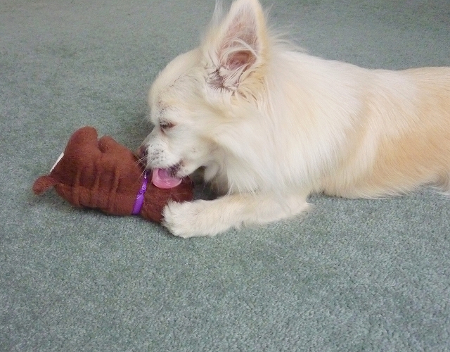 お気に入りのオモチャを毛繕い。。